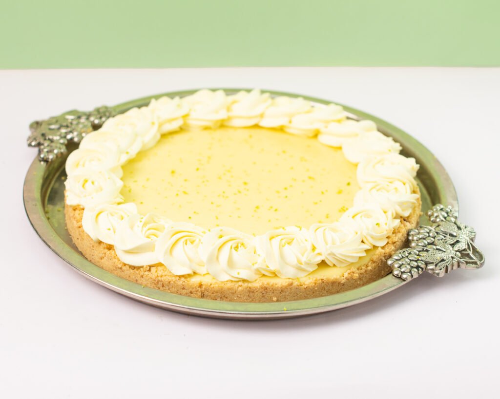 Tarta de lima con leche condensada casera y base de galletitas de manteca caseras, decorada con flores de crema chantilly y ralladura de lima