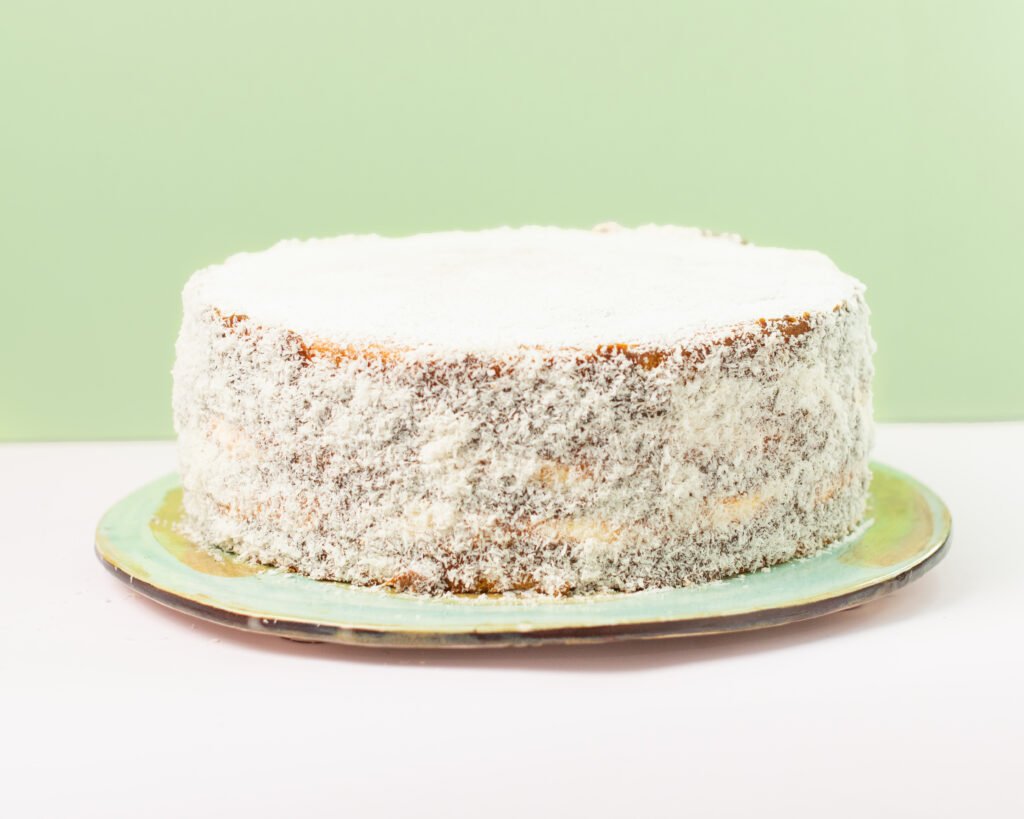Lo hacemos con un genoise de vainilla, rellena con dulce de leche, discos de merengue caseros, crema de leche y nueces. Está recubierta con coco rallado